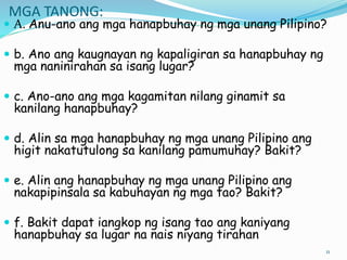 Pagsasaka at pangingisda ang ikinabubuhay ng mga unang Pilipino. Dahil hindi pa laganap ang kalakalan at iba pang kaugnay na hanapbuhay Umaasa sa mga likas na yaman ang tao noon upang mabuhay. Ano ang kabuhayan ng mga sinaunang Pilipino.