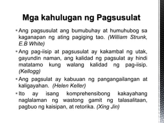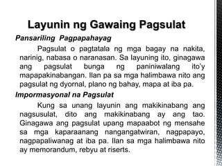 Katanggapan ng Baybaying PUP Panulat ng Unang Pilipino sa mga Guro sa Mataas na Pampublikong Paaralan sa Lungsod ng Naga Camarines Sur Taong Panuruan 2015-2016 March 2016. WIKA - Mahalagang matiyak kung anong uri ng wika ang gagamitin upang madaling maiakma sa uri ng taong babasa ang akdakomposisyono pananaliksik na nais mong ibahagi sa iba. LAYUNIN-ito ang magsisilbing giya mo sa.