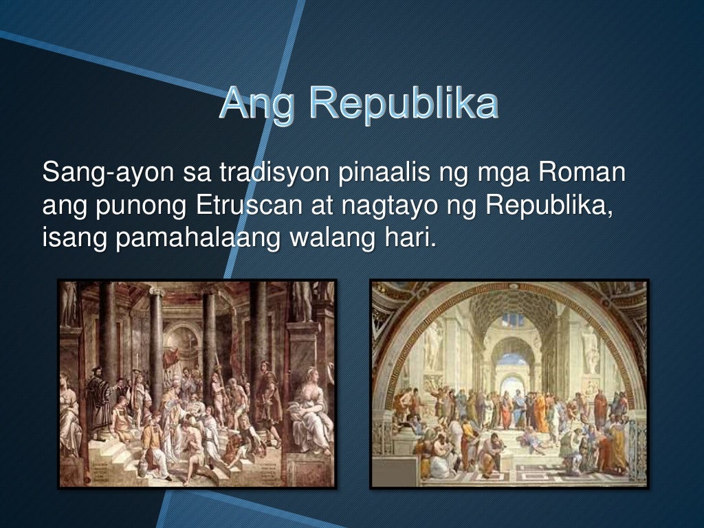 Ito ang tawag sa lugar na naging sentrong pulitika at komersiyo ng sinaunang Rome. Ang Republikang Romano Latin. Panahon ng kapayapaan at kasaganaan sa Rome.