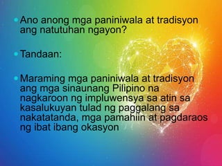 Balik-aral Kilalanin ang paniniwala at tradisyong Pilipino na inilalarawan ng mga sumusunod na pahayag. Kami ay magbibigay ng mga Halimbawa. Sila ay may mga paniniwala at tradisyon na kanilang sinusunod hanggang sa kasalukuyan.