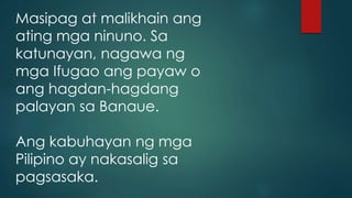 Mahiligmagdiwang ng pista ang. Natuto ang mga Pilipino na iangkop ang kanilang kabuhayan sa kanilang kapaligiran. Mga Hanapbuhay ng Sinaunang Pilipino.